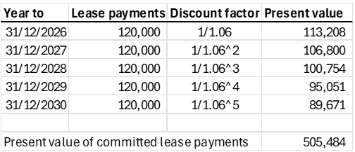 For an entity with a 31st December year-end and a commitment at 1st of January 2026 to pay a further 5 years rent at £10,000/month, the lease liability could be calculated as follows (assuming an IBR of 6%):