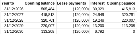The right-of-use asset is then depreciated over the remainder of the lease term. In our example this would be (£505,484 / 5) = £101,097 per year.